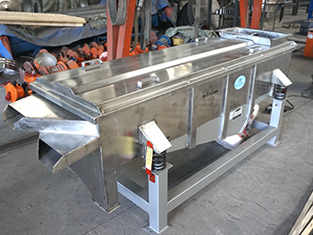 直線篩依靠?jī)蓚€(gè)相同頻率的反向電機(jī)使物料在篩面上直線向前跳躍,小于篩孔孔徑的物料通過(guò)篩網(wǎng)落入下層,將原本雜亂無(wú)章的顆粒分離,即按粒度分層,形成底部小顆粒、頂部粗顆粒的排列,從而達(dá)到對(duì)物料進(jìn)行篩分和分級(jí)的目的