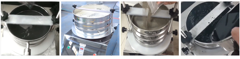 電磁試驗采用電磁振動器作為振動源,電磁振動器的振動帶動篩機低位振動,再通過底座傳遞到底座上由粗到細排列的一組標準試驗篩,同時安裝在下部的振動電機(或往復機構)將物料精選篩分,物料在標準檢驗篩的篩面上振動,使小于篩網孔徑的物料顆粒篩入下層檢驗篩,層層篩分,只有試驗篩的每一層都留有相同的粒徑,以達到不同的粒徑分離。