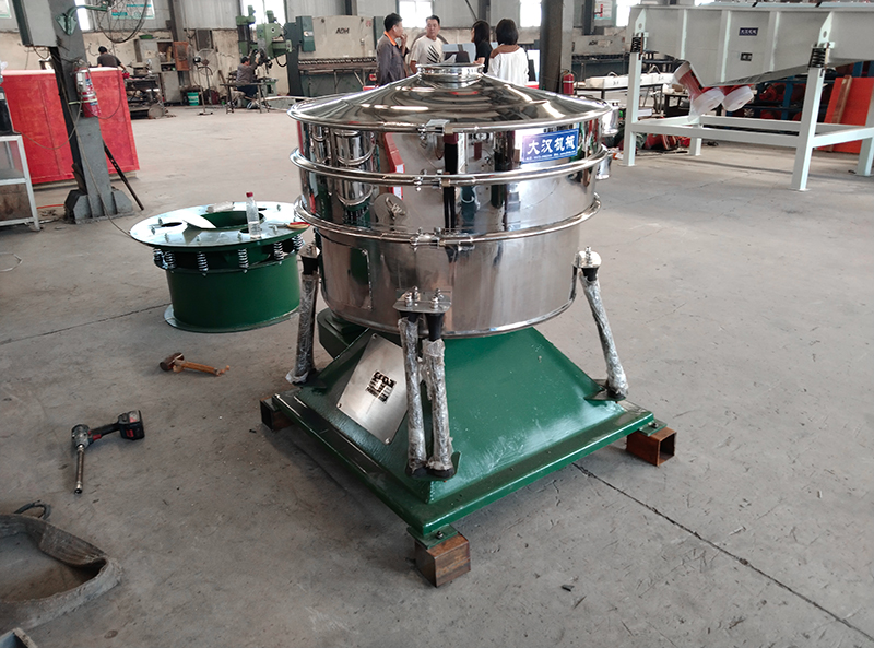 食品搖擺篩基本的回轉(zhuǎn)運(yùn)動(dòng)與人工篩分相類似,食品搖擺篩接通電源后篩體啟動(dòng),篩箱在振動(dòng)裝置的驅(qū)動(dòng)下作相似圓周運(yùn)動(dòng),此時(shí)篩箱帶動(dòng)整個(gè)篩面作周期性運(yùn)動(dòng),篩面上的物料隨著篩箱在篩網(wǎng)上作定向跳躍式運(yùn)動(dòng),在此過(guò)程中,小于篩網(wǎng)網(wǎng)孔的物料落到篩網(wǎng)下層,從下出料口排出,大于篩網(wǎng)網(wǎng)孔經(jīng)的物料從上出料口排出,中間層從中間出料口排出,從而完成物料的篩分目的。